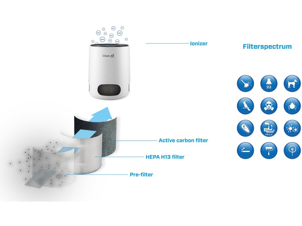 Ionizátor (bez ozónu, DIN EN 60335-2-65) – produkuje >3 000 000 negativních iontů/cm³, které vážou škodliviny a pachy, čímž je odstraňuje z ovzduší.