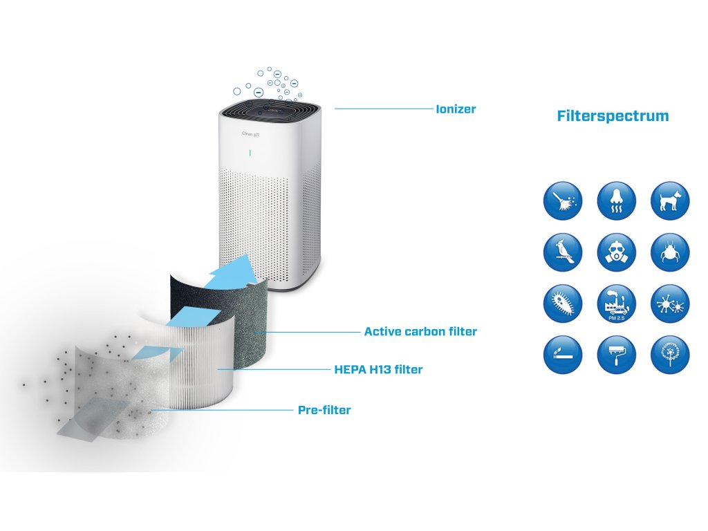 Čistička vzduchu CA-507 Smart využívá 6stupňový filtrační systém, který účinně odstraňuje částice, plyny i pachy. Poskytuje ochranu proti: