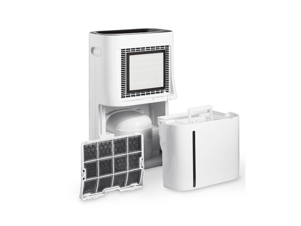 Zařízení kombinuje výkonné odvlhčování a nepřetržité čištění vzduchu. Jakmile je dosaženo nastavené vlhkosti, odvlhčování se zastaví, ale čištění vzduchu běží dál – celoročně.