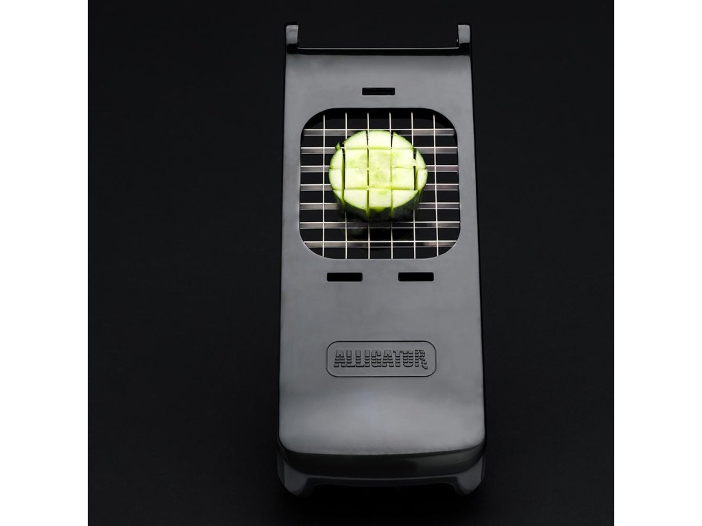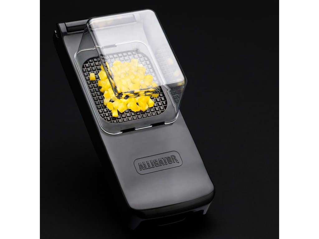 - Kráječ Alligator krájí tyčinky a kostky o rozměrech 6 mm x 6 mm, zásobník chytře pochytá vše, co je nasekané, na jedno místo.