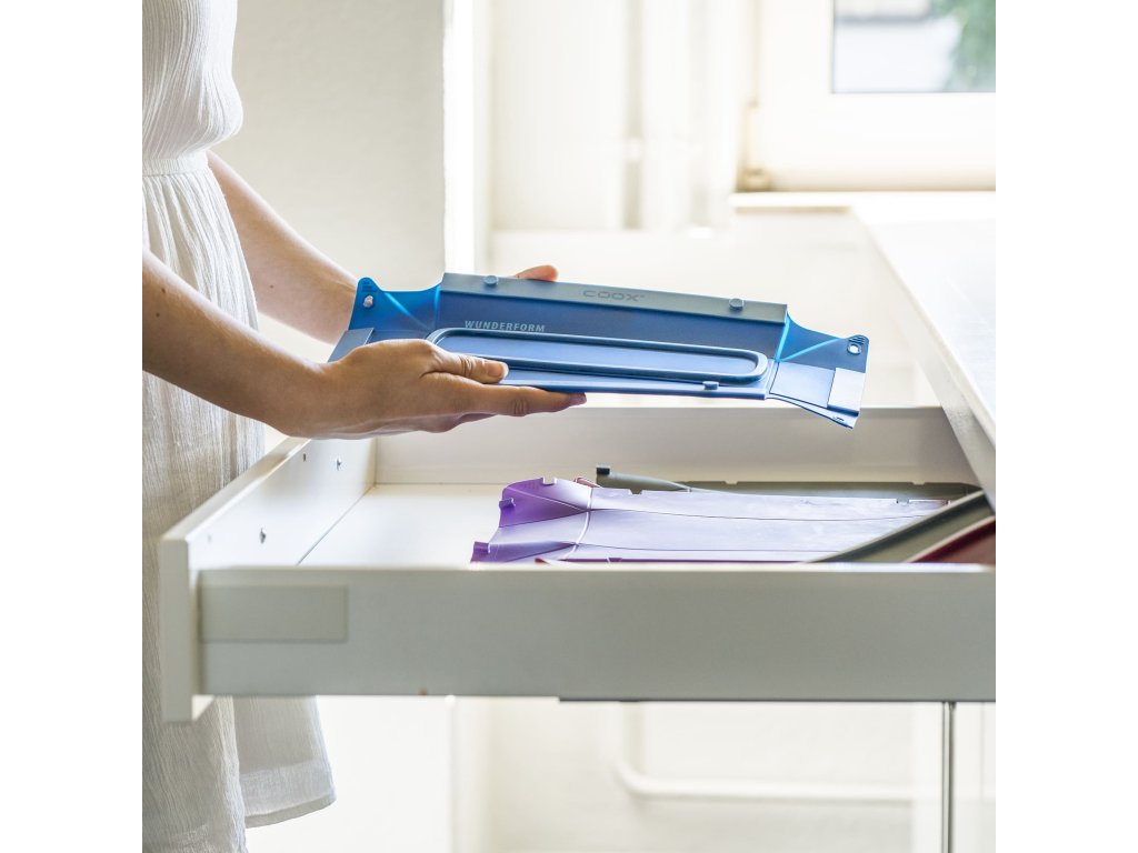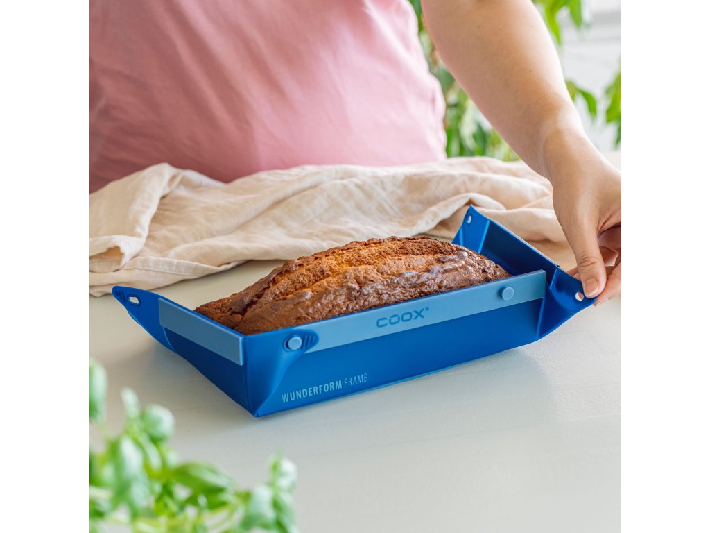 Revoluce v pečení! Rozkládací forma coox WUNDERFORM Frame M změní způsob, jak připravujete sladká i slaná jídla. Díky skládacím rohům formu snadno rozevřete a dort, chléb či zapečené jídlo nemusíte vyklápět – jednoduše servírujete přímo z formy. Kovové výztuže zajišťují pevnost, silikonový materiál s antiadhézní úpravou maximální komfort. Pro bezpečné krájení přímo na silikonové formě můžete využít speciální multifunkční nástroj. Případně lze formu pro snadný transport a skladování doplnit o plastové víko.