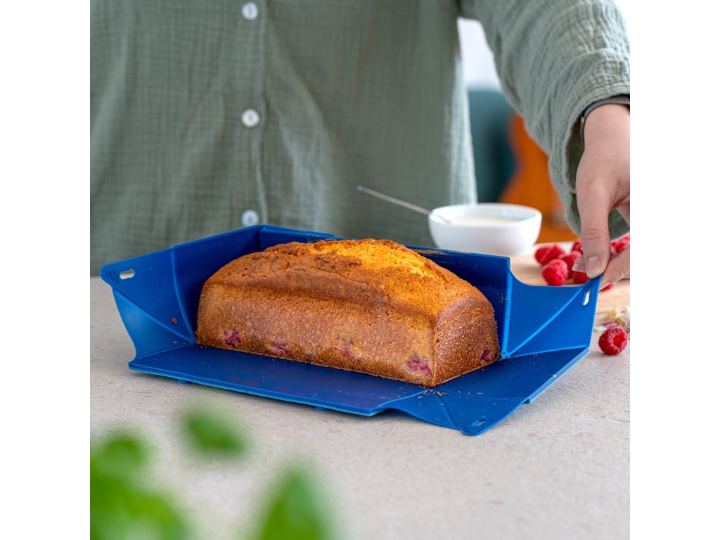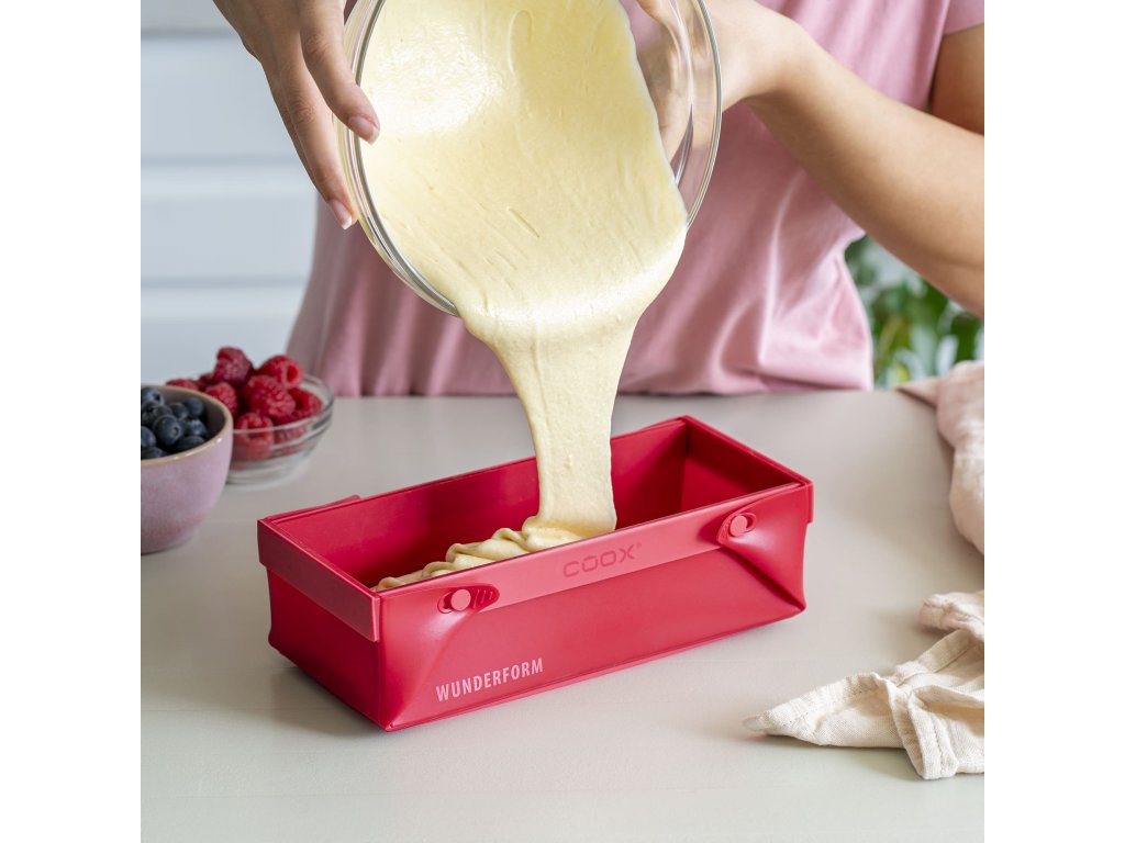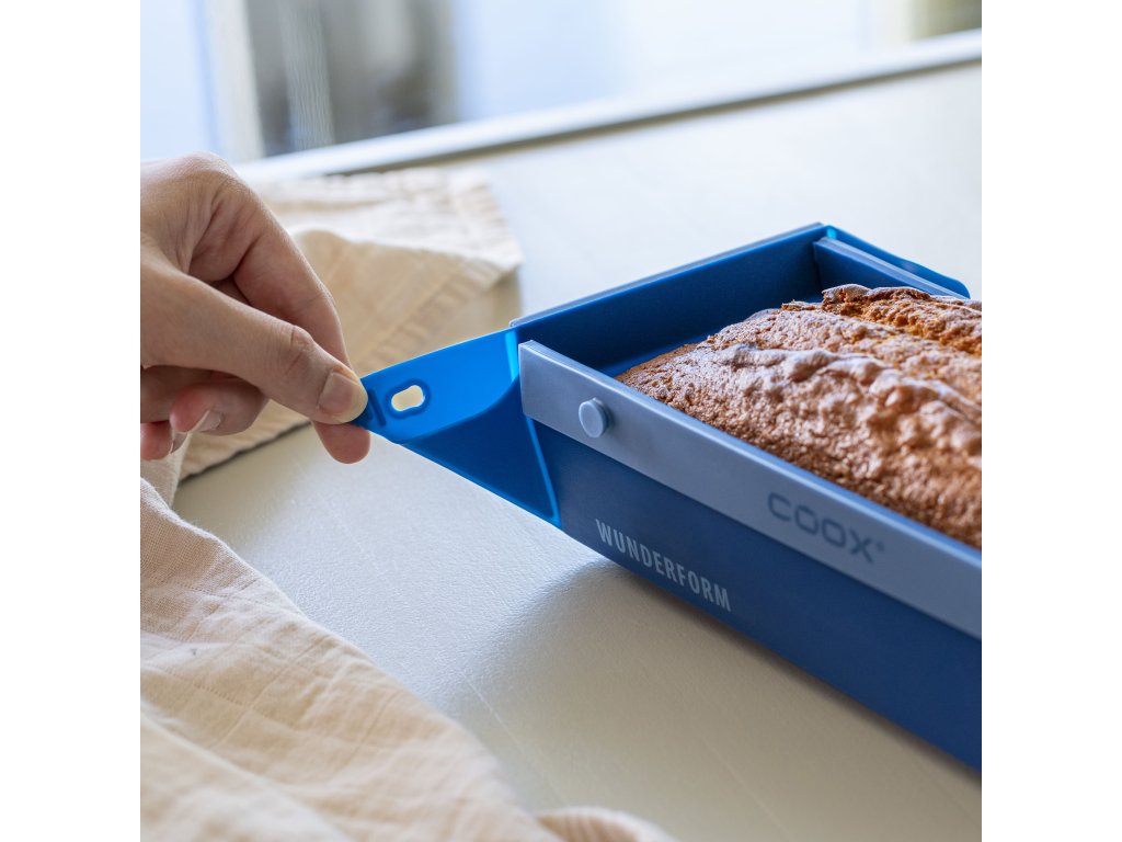 Revoluce v pečení! Rozkládací forma coox WUNDERFORM Frame S změní způsob, jak připravujete sladká i slaná jídla. Díky skládacím rohům formu snadno rozevřete a dort, chléb či zapečené jídlo nemusíte vyklápět – jednoduše servírujete přímo z formy. Kovové výztuže zajišťují pevnost, silikonový materiál s antiadhézní úpravou maximální komfort. Pro bezpečné krájení přímo na silikonové formě můžete využít speciální multifunkční nástroj. Případně lze formu pro snadný transport a skladování doplnit o plastové víko.