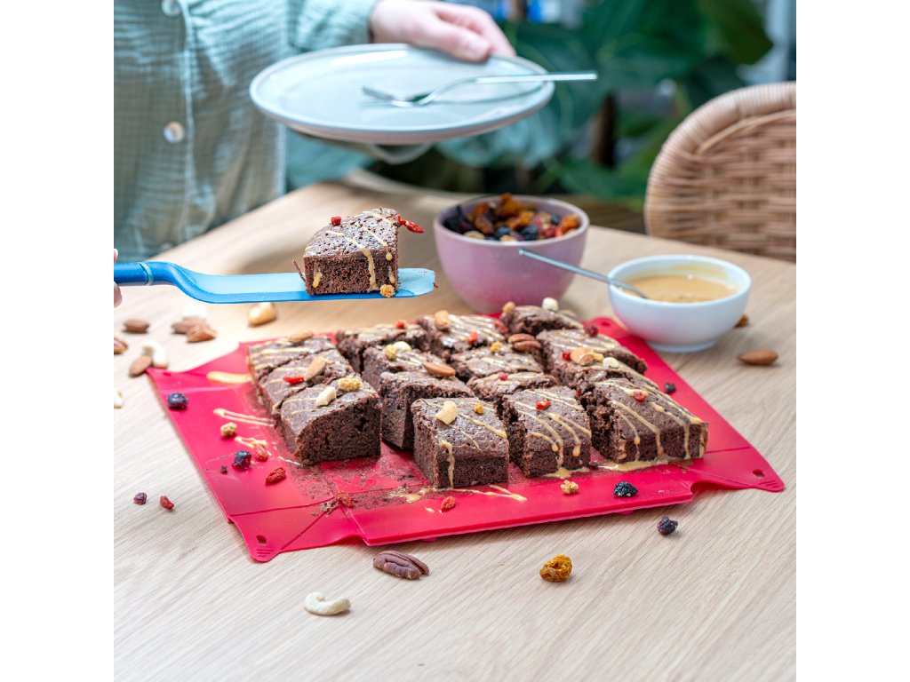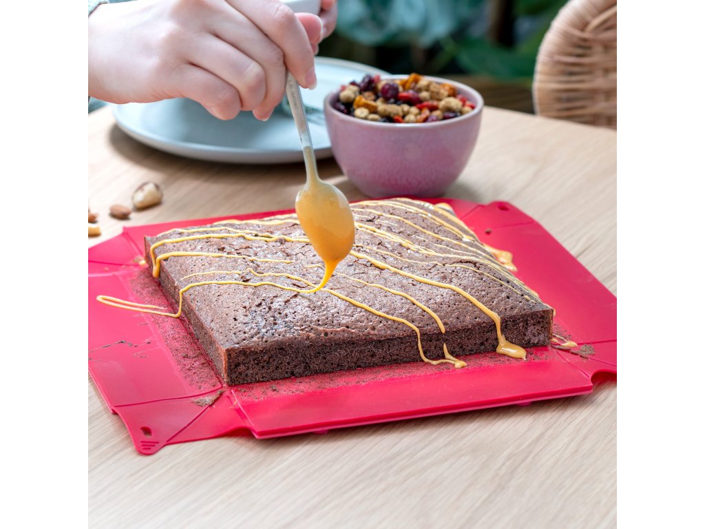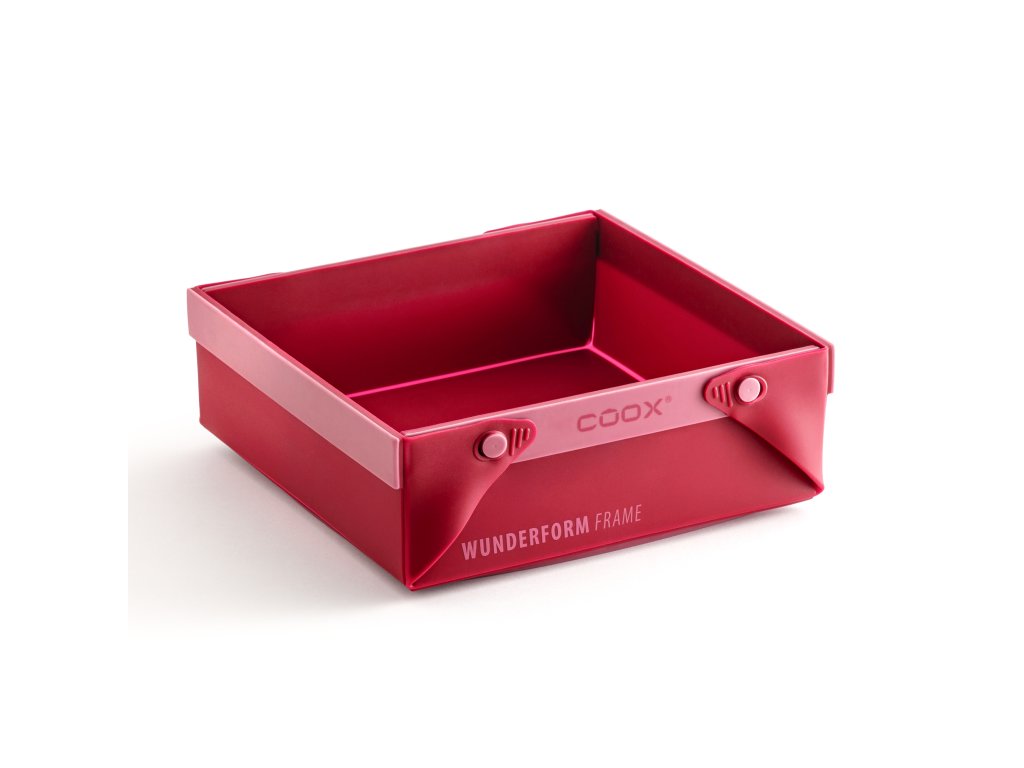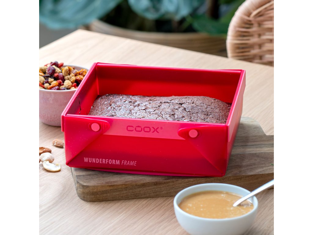 Revoluce v pečení! Rozkládací forma coox WUNDERFORM Frame SQ změní způsob, jak připravujete sladká i slaná jídla. Díky skládacím rohům formu snadno rozevřete a dort, chléb či zapečené jídlo nemusíte vyklápět – jednoduše servírujete přímo z formy. Kovové výztuže zajišťují pevnost, silikonový materiál s antiadhézní úpravou maximální komfort. Pro bezpečné krájení přímo na silikonové formě můžete využít speciální multifunkční nástroj. Případně lze formu pro snadný transport a skladování doplnit o plastové víko.