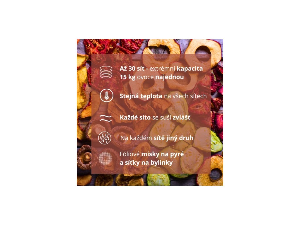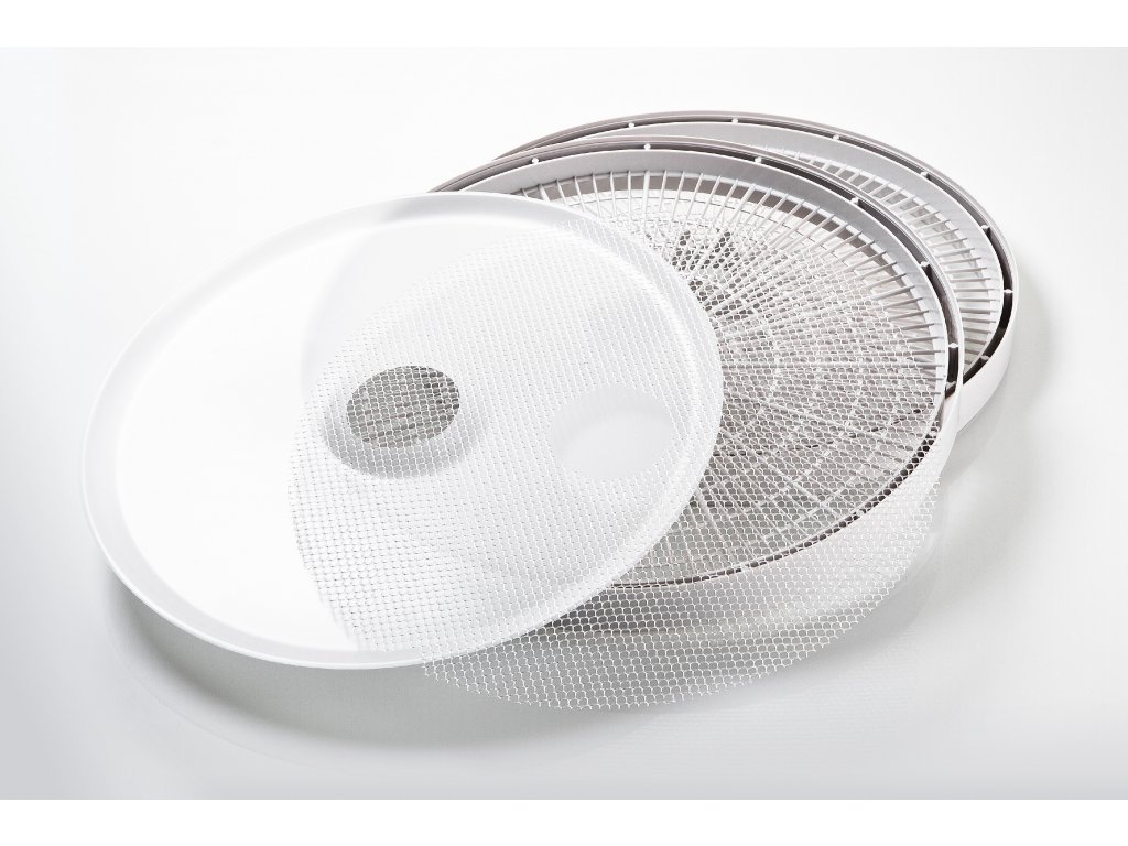 Zařízení umožňuje provádět sušení na více fóliových miskách najednou. V základní sestavě se můžete těšit na 5 sít. Pokud by vám to ovšem nestačilo, můžete kapacitu jednoduše rozšířit až na 15 sít a získat tak skutečně velkokapacitní přístroj.