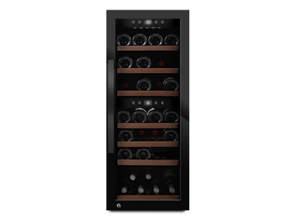 Vinotéka je navržena pro všechny typy lahví, takže je tu místo i pro vaše šumivá vína. Chladnička na víno má robustní tlačítka pro ovládání funkcí a nastavení se zobrazuje digitálně. Výsuvné dřevěné police hladce kloužou po stabilních kolejnicích polic.