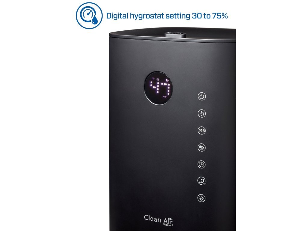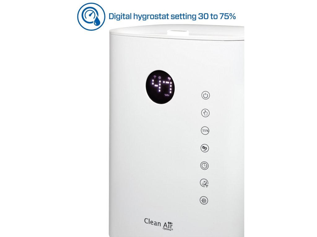Přehledný digitální ovládací panel na přední straně zařízení obsahuje sedm dotykových tlačítek pro snadný výběr požadovaných nastavení. Zvlhčovač CA-604W Smart můžete také ovládat pomocí aplikace Clean Air Optima App® přímo z vašeho mobilního telefonu odkudkoliv.